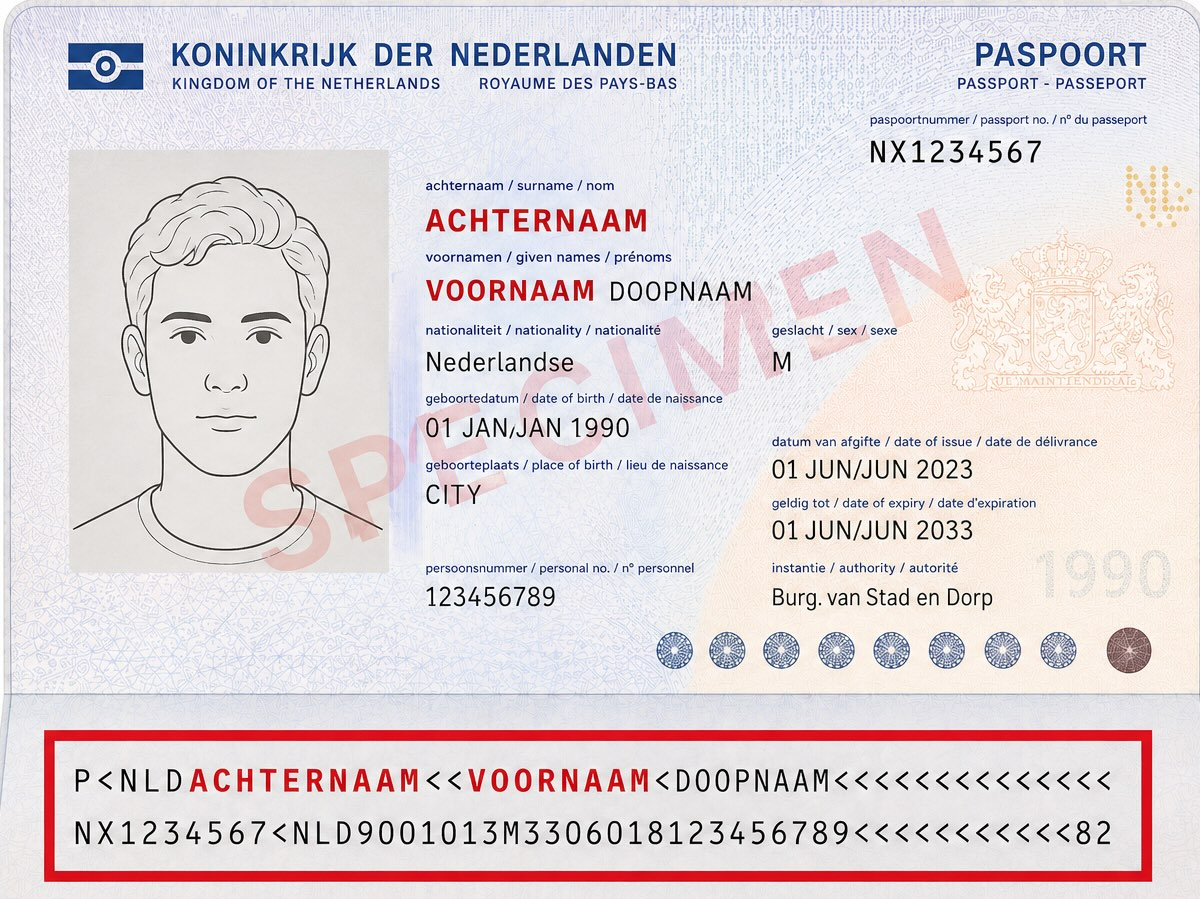 Luchtvaartmaatschappijen vereisen de naam, zoals weergegeven in de Machine Readable Zone (MRZ-barcode) van je paspoort of ID-kaart. Zie het voorbeeld van de MRZ-barcode met rode markering hieronder:
