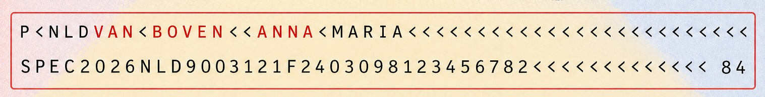 Luchtvaartmaatschappijen vereisen altijd de juiste namen op je vliegticket. Je houdt hierbij het makkelijkst de Machine Readable Zone (MRZ-barcode) van je paspoort of ID-kaart aan. Je vult de namen in, zoals getoond in deze barcode.